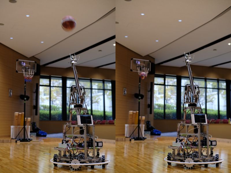 [Robot shooting basketball]