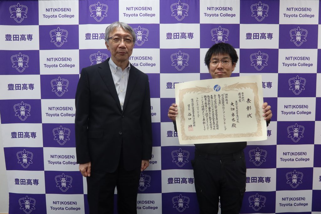 今回の表彰式では、全国の高専教員を対象として実施された表記顕彰において優秀賞(若手部門)を受賞した大畑卓也准教授(環境都市工学科)を表彰し、その功績を称えました。