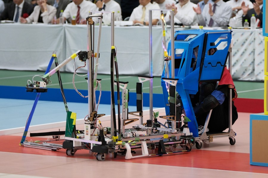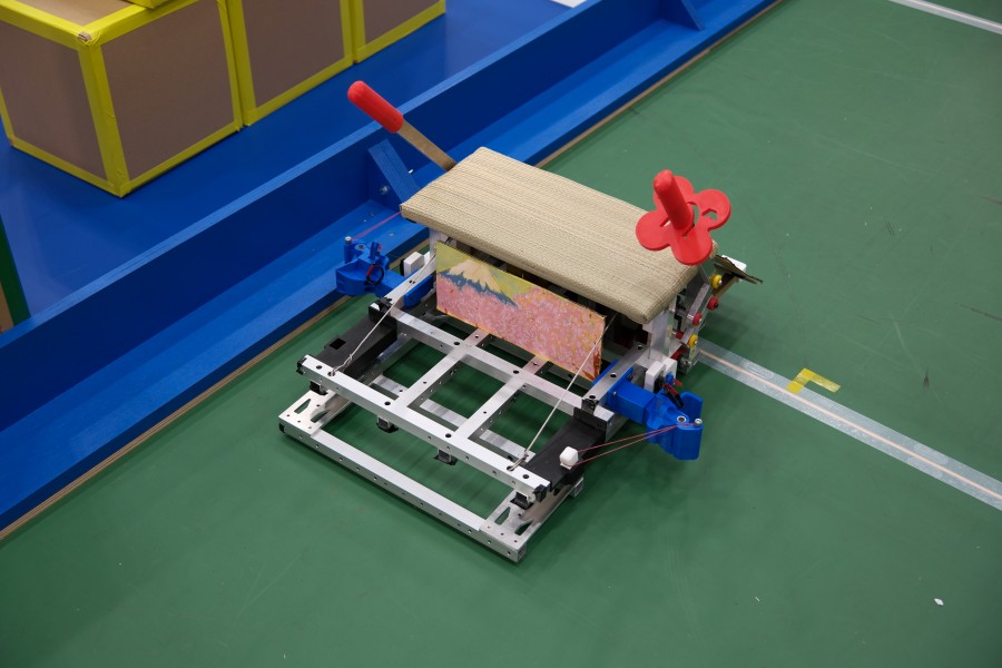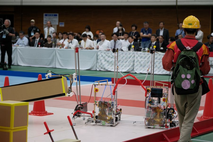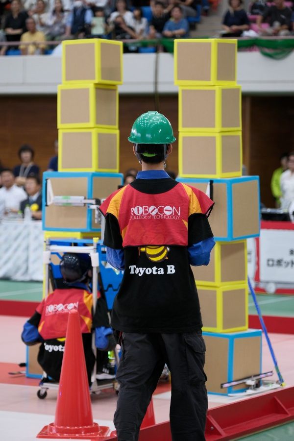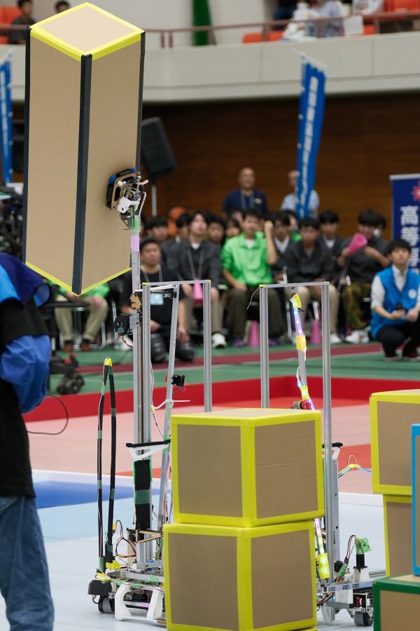 競技課題名は「Great High Gate」で、ロボットがサイズの異なるダンボール箱をアーチ状に積み上げてゲートをつくり、学生が乗る自作の台車と連結して一緒にゲートをくぐります。ゲートの高さが高いほど得点が高くなるため、学生たちは、より高くダンボール箱を積み上げられるロボットの製作に創意工夫を凝らして取り組んできました。