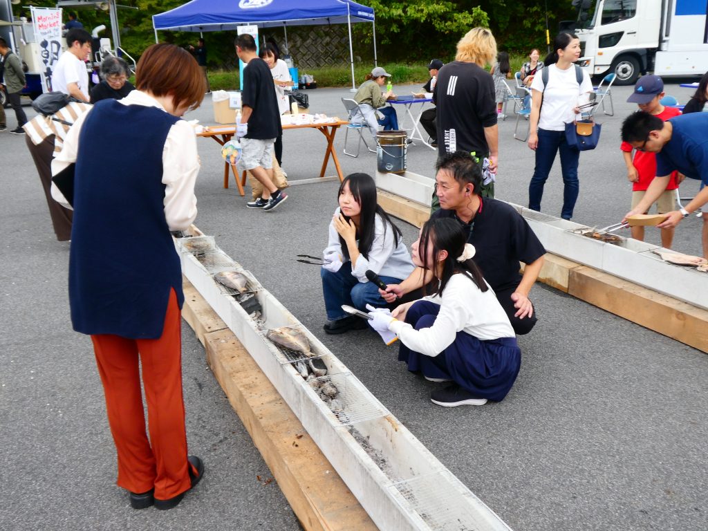 【干物を焼くブースでインタビューされる学生】