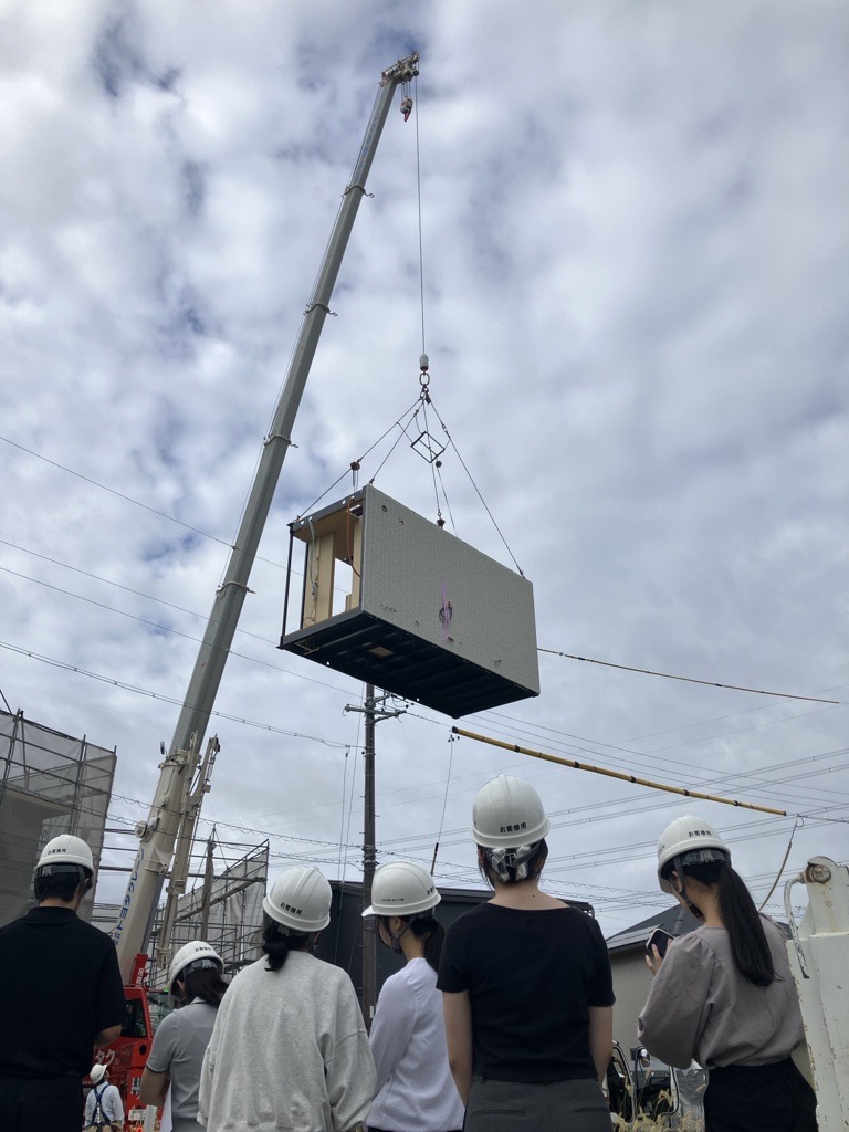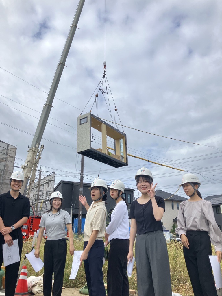 トヨタすまいるライフ様との産学連携事業(今年で8棟目)において、学生たちが社員の方と一緒にデザインした住宅が姿を現しました。 10月18日に敷地への住宅ユニットの据付が実施され、現場での朝の朝礼から参加した学生たちは、クレーンで次々と吊り上げられ、据付されていく様子を見守りました。半日で住宅の形になるスピードに驚きました。3月の完成が楽しみです。