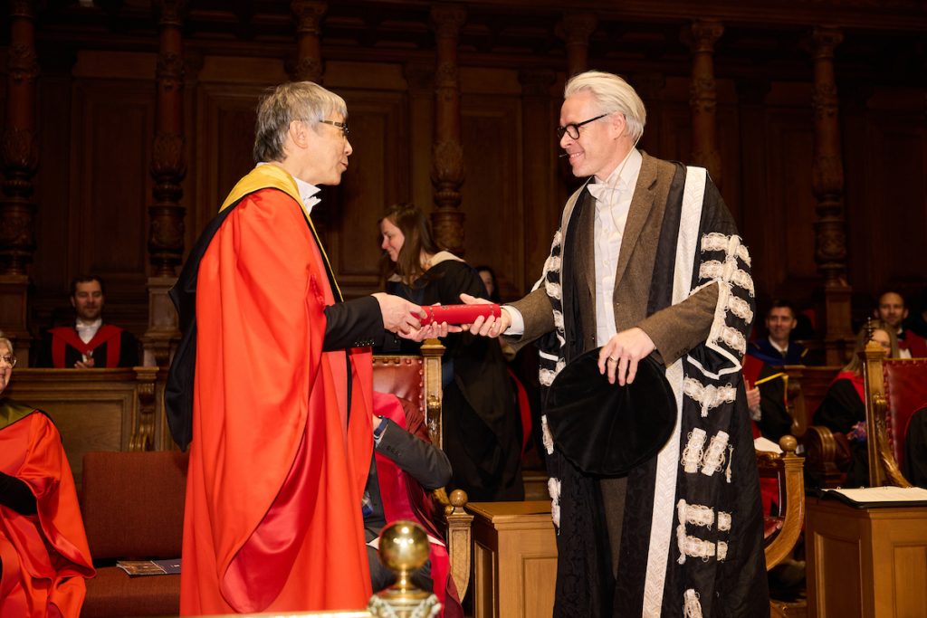 こうした功績が高く評価され、長年の共同研究者であるエディンバラ大学のニール・ロバートソン教授からの推薦により、今回の受章に至りました。授与式は卒業式と同日に執り行われ、受章スピーチでは、名古屋大学とエディンバラ大学間の強力な関係を築けたことに感謝を述べるとともに、名古屋大学及び豊田工業高等専門学校の所在地である東海地方が産業集積地であることに加え、スタジオジブリ作品の世界観を表現した「ジブリパーク」に近く、訪れれば日本のものづくりの神髄に触れられるとともに「トトロにも会える」とユーモアを交えて紹介しました。エディンバラの学生にとって馴染みの薄い名古屋市・豊田市の魅力を親しみやすく伝え、会場からは大きな拍手が送られました。